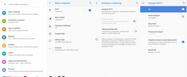 Sappiamo bene che Android e le sue impostazioni possono variare da costruttore a costruttore ed è quindi impossibile trattare nello specifico ogni declinazione di Android; prenderemo come riferimento la versione pura di Android e vedrete che nelle altre versioni non sarà poi così diverso. Al limite basterà utilizzare la funzione di ricerca delle impostazioni con la parola chiave hotspot o tethering per trovare il menu che ci interessa.In Android “stock” possiamo attivare l’hotspot andando in ImpostazioniReti e InternetHotspot e tethering e qui scegliere se vogliamo attivare l’Hotspot Wi-Fi o il Tethering USB che sarà disponibile all’attivazione solo dopo aver collegato il telefono al computer con, appunto, il cavo USB. Come detto non tratteremo il Tethering Bluetooth. Se scegliamo Hotspot Wi-Fi potremo scegliere altre opzioni come il nome che vorremo assegnare alla rete, il tipo di sicurezza e naturalmente la password. Sarà possibile scegliere anche la banda da utilizzare che, salvo necessità particolari, consiglio di lasciare a 2,4GHz per compatibilità con dispositivi più datati.