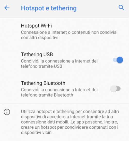 Come detto, se connettiamo il nostro smartphone con il cavo USB al nostro computer, diventerà possibile attivare anche il Tethering USB che escluderà automaticamente l’Hotspot Wi-Fi (non è possibile tenerli attivi entrambi contemporaneamente). Una cosa interessante di questa funzione è la possibilità di sfruttare anche una connessione Wi-Fi terza (ad esempio, quella di casa, dell’albergo, del pub, …) anziché il piano dati della SIM, trasformando di fatto il nostro cellulare in una sorta di antenna Wi-Fi esterna per il nostro computer.