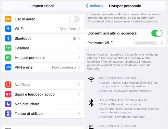 Su iPhone per attivare l’hotspot wifi, dovremo andare in ImpostazioniHotspot personale e attivare lo switch Consenti agli altri di accedere. Sotto questa voce sarà possibile cambiare la password (con una ugualmente sicura ma magari un po’ più facile da ricordare rispetto a quella di default); più sotto ancora ci saranno utili indicazioni sui metodi di connessione che non prevedono nessun altra operazione da fare sull’iPhone qualunque sia il metodo di connessione che sceglieremo (Wi-Fi, USB o Bluetooth).